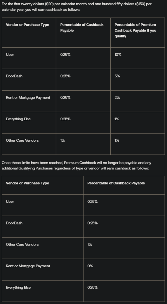 Enzo, after meeting requirements which I will get into later, offers the following cash back. The cash back earned is capped at $20 per month and $150 cumulative for all of these categories. They call this their “Premium” cash back